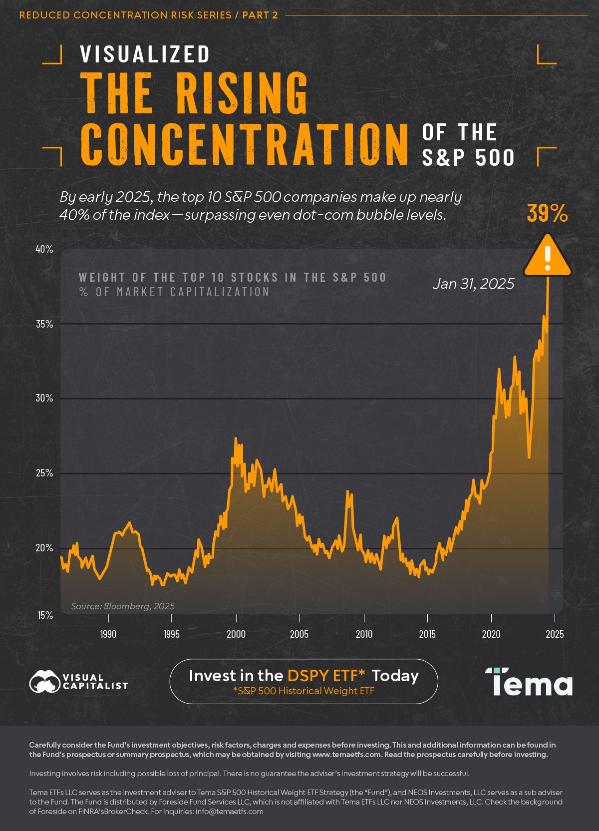 Concentration risk demands attention – The top 10 stocks driving 39% of S&P 500 weight creates fragility